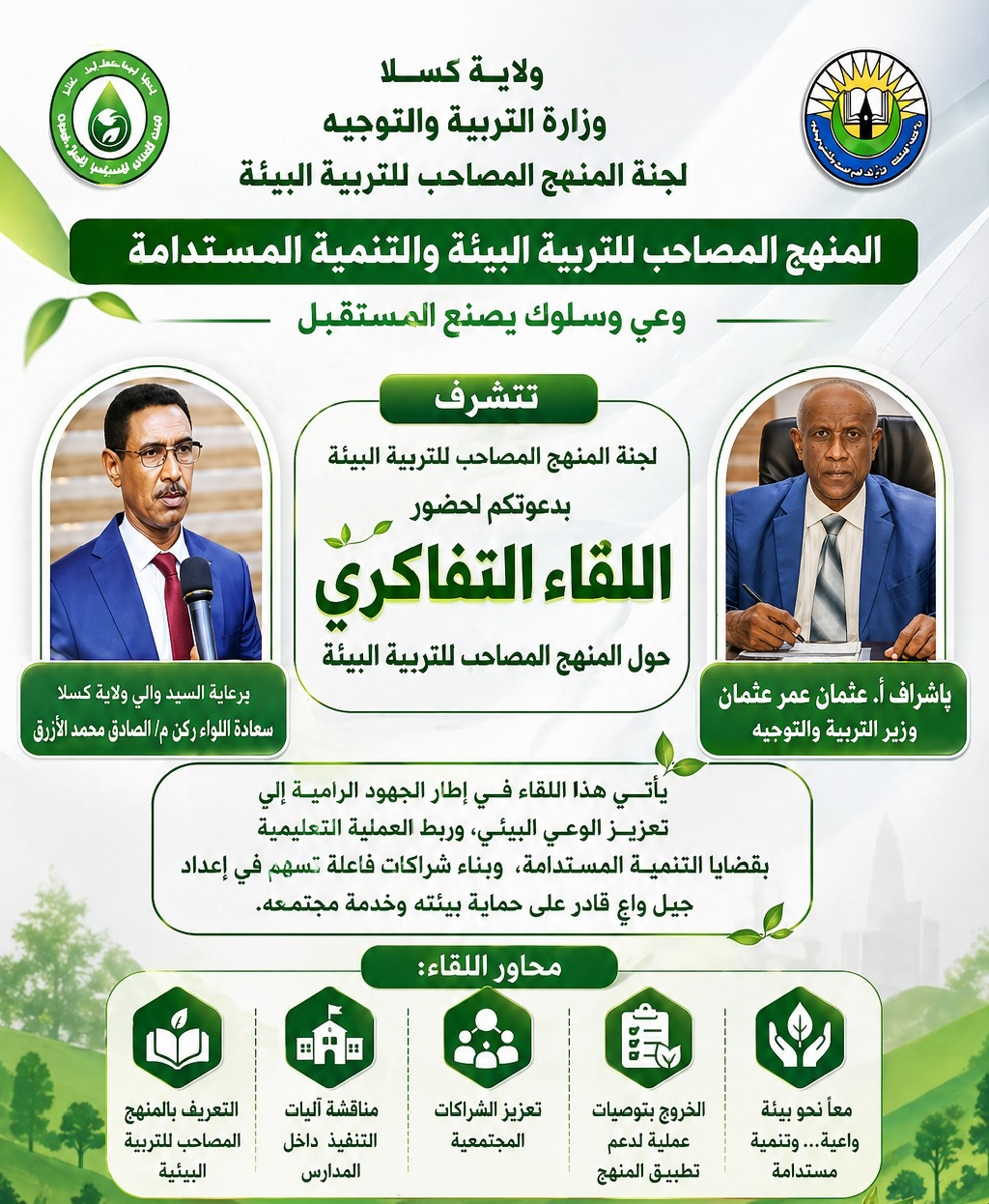 فرغت وزارة التربيه والتوجيه اللجنة العليا للمنهج المصاحب للتربية البيئية والتنمية المستدامة بــولاية كسلا من وضع كافه الترتيبات لانعقاد اللقاء التفاكري حول المنهج المصاحب للتربيه البيئية يوم الخميس القادم الساعة الحادية عشر صباحا بقاعة جامعة العلوم الصحية بكسلا تحن شعار( بيئتنا مسئوليتنا جميعا )