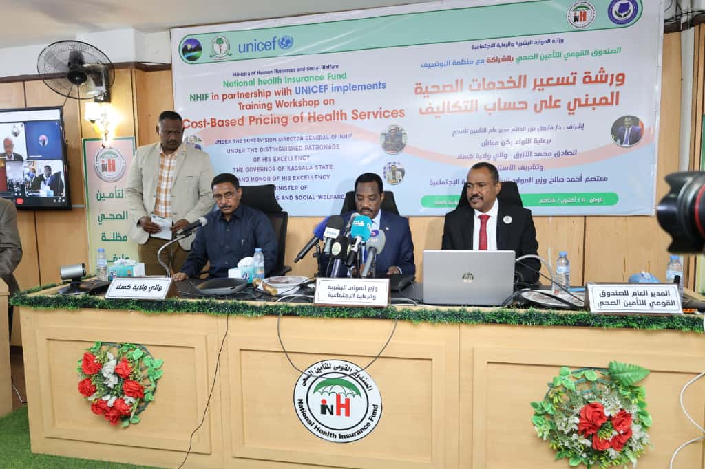 وأوضح صالح لدى حديثه في ورشة “تسعير الخدمات الصحية المبني على حساب التكاليف” التي أقامها الصندوق القومي للتأمين بالشراكة مع منظمة اليونسيف، في قاعة الصندوق بولاية كسلا، صباح اليوم، أن تسعير الخدمات خطوة استراتيجية لترشيد الموارد وتحقيق العدالة للمستفيدين، ونبه إلى أن وزارته تعمل بالتنسيق مع وزارتي الصحة والحكم الاتحادي والمجتمع الدولي لتحقيق الحماية الصحية وتعزيز النظام الصحي في البلاد، وأشاد بتدخلات المنظمات الدولية التي قامت بدعم وإنشاء عدد من المراكز الصحية وتقديم الخدمات الدوائية وتدريب الكوادر الصحية، وأعتبر أن الورشة تعتبر فرصة لتبادل الخبرات وصياغة تسعير حقيقي يحقق العدالة في تقديم الرعاية الصحية.