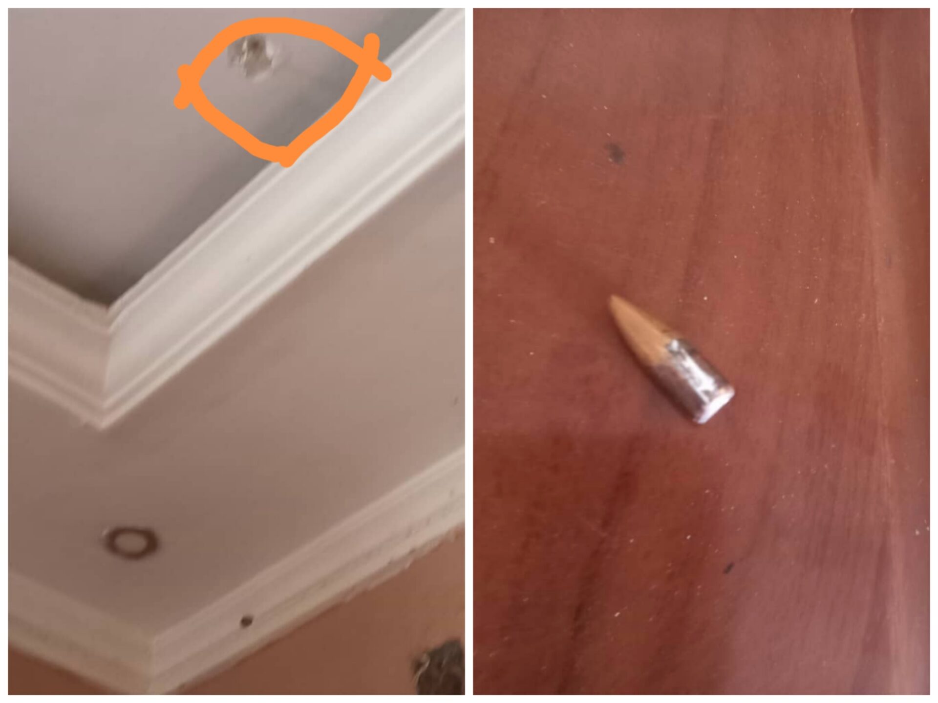 يظهر في الإطار الأعلى مكان اختراق الرصاصة للسقف.