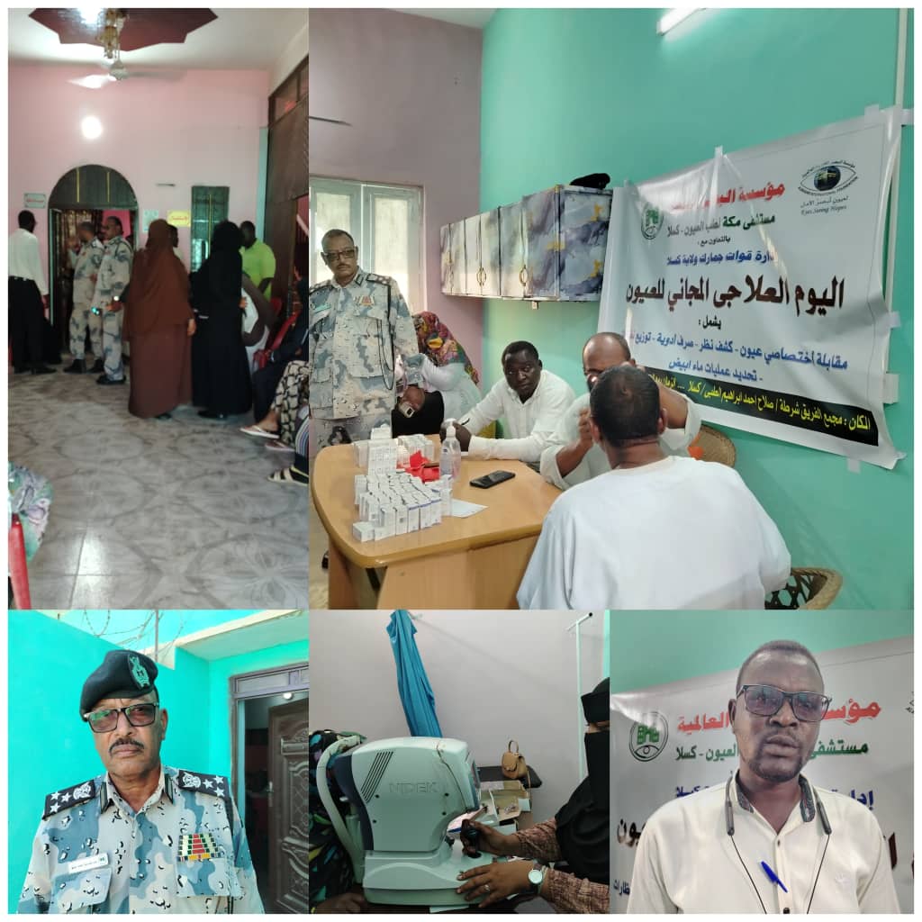 أقامت إدارة قوات شرطة الجمارك بولاية كسلا، بالتعاون مع مؤسسة البصر العالمية (مستشفى مكة لطب العيون/ كسلا) ، صباح اليوم الجمعة، يوماً علاجياً مجانياً للعيون بمجمع الفريق شرطة صلاح أحمد إبراهيم الطبي  أشتمل على مقابلة اختصاصي العيون، كشف نظر، صرف أدوية، توزيع نظارات، تحديد عمليات ماء بيضاء.